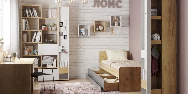 Декоративный куб в декорах Белый, Дуб Золотистый и Графит с белой задней стенкой можно использовать как навесную полку для книг и для декорирования интерьера. Куб 1 - оригинальное решение для декора комнаты подростка.