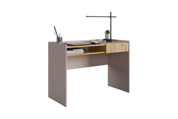 Корпус стола выполнен в цвете кашемир, что придает ему современный и спокойный вид, легко сочетающийся с любым интерьером. Выкатной ящик в цвете "дуб крафт золотой", декорирован принтом, имитирующим вертикальную фрезеровку, что добавляет столу уникальности и роскоши.