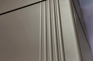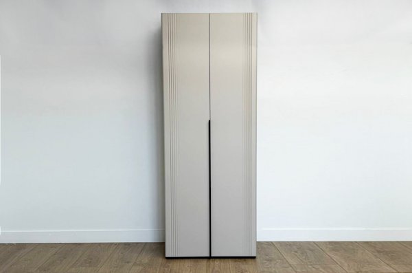 Корпус шкафа изготовлен из ЛДСП, что гарантирует прочность и долговечность. Фасады, выполненные из МДФ в плёнке ПВХ, не только выглядят эстетично, но и защищают шкаф от повреждений. Особое внимание заслуживает фрезеровка фасадов, которая придаёт шкафу изысканный вид.