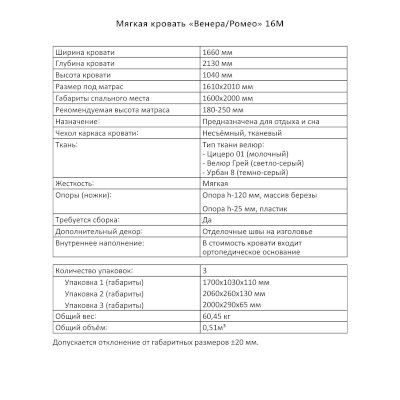 Размер спального места, см 160х200