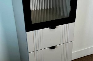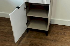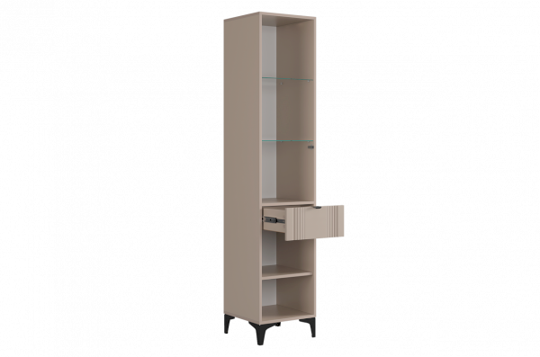 Шкаф оснащён надёжной металлической ручкой и имеет удобное внутреннее наполнение: надёжные полки за стеклянной и глухой дверцами, а также выкатной ящик. Это позволяет рационально использовать пространство.
